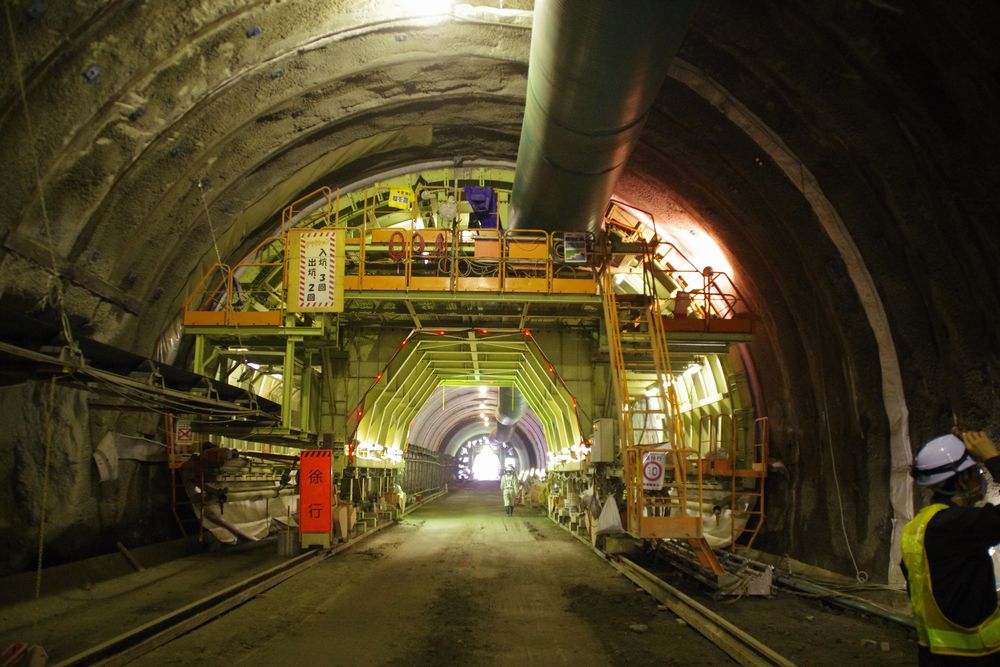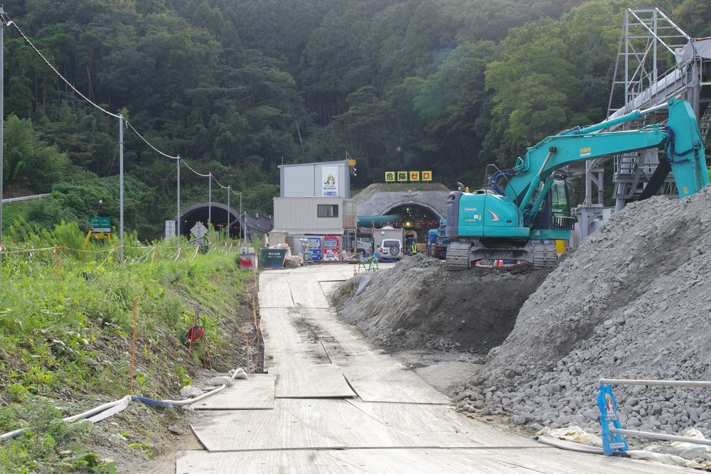 左側の隧道が現在供用中の館山道、右側が工事中の隧道。