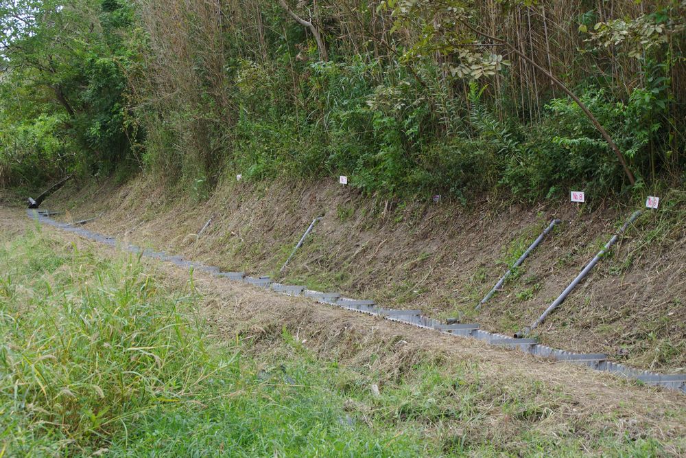 表記の現場見学会が先月末9/28(水)に行われました。お昼過ぎにJR蘇我駅をバスで出発、まずは、富津市山中地区の地すべり防止区域上畑地区の地すべり防止の抑制工を見学しました。