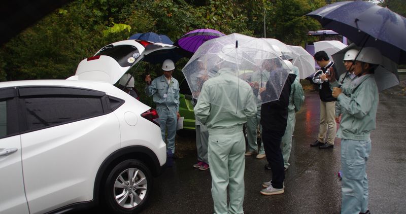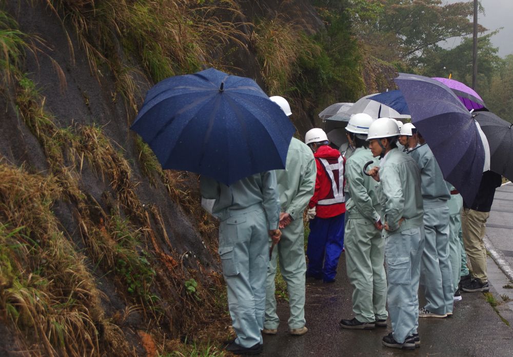 午後からバスで現場へ移動しましたが、あいにくの雨天となりドローンの飛行デモは中止となりました。それでも、雨の中法面点検の実際を熱心に体験しているのが印象的でした。