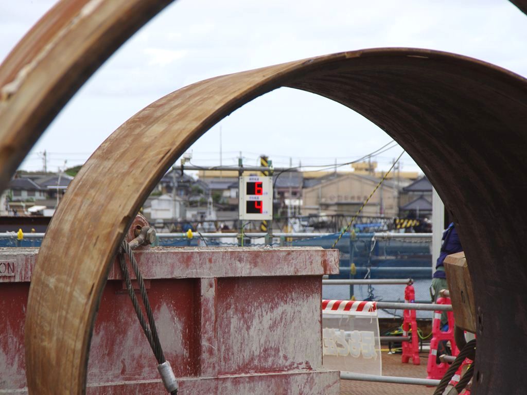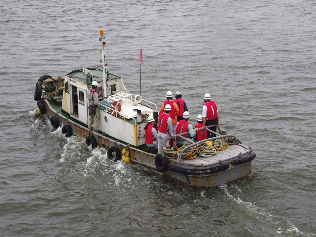 さて、橋脚撤去現場は水上にあるため、連絡船にて現地入りです。